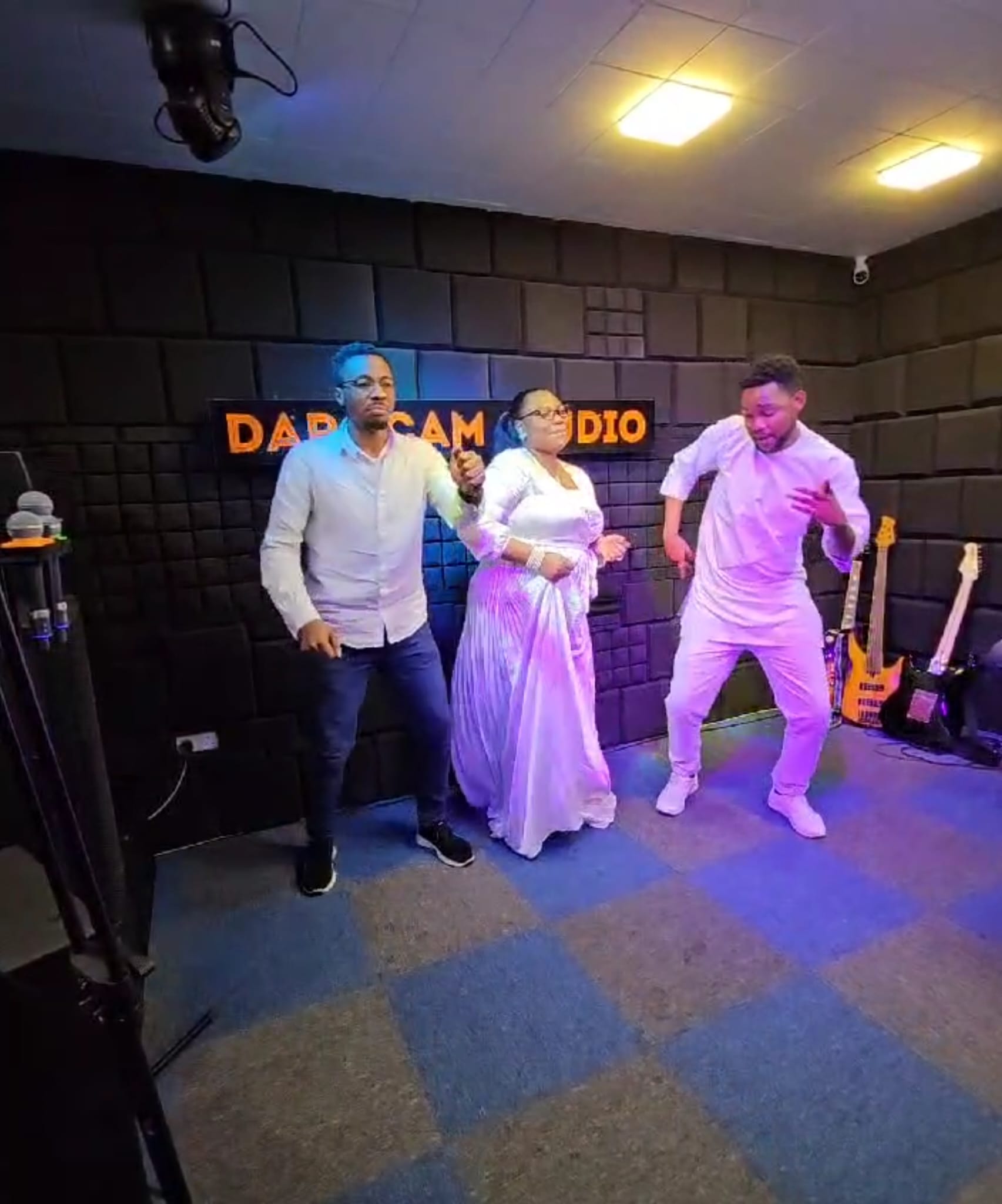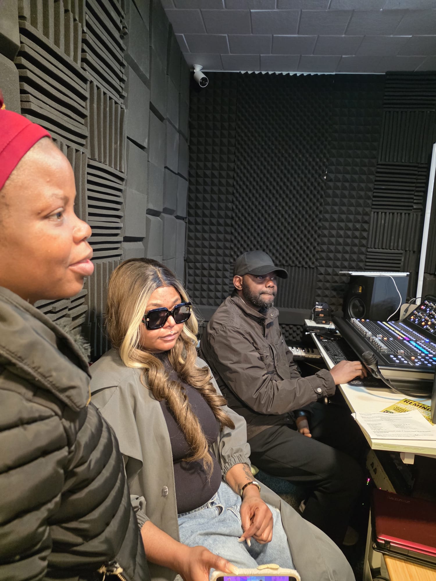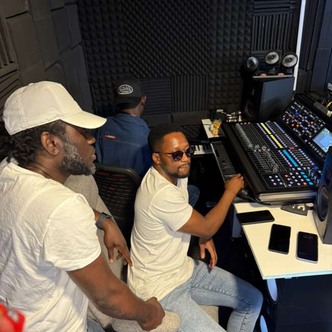 Inside the control room, the sound engineer fine-tunes the mix on the M32 console while his colleague looks on. A lady stands nearby, phone in hand, likely listening to the playback. It’s a glimpse into the teamwork and attention to detail that shape every sound at Darocam Studio.
