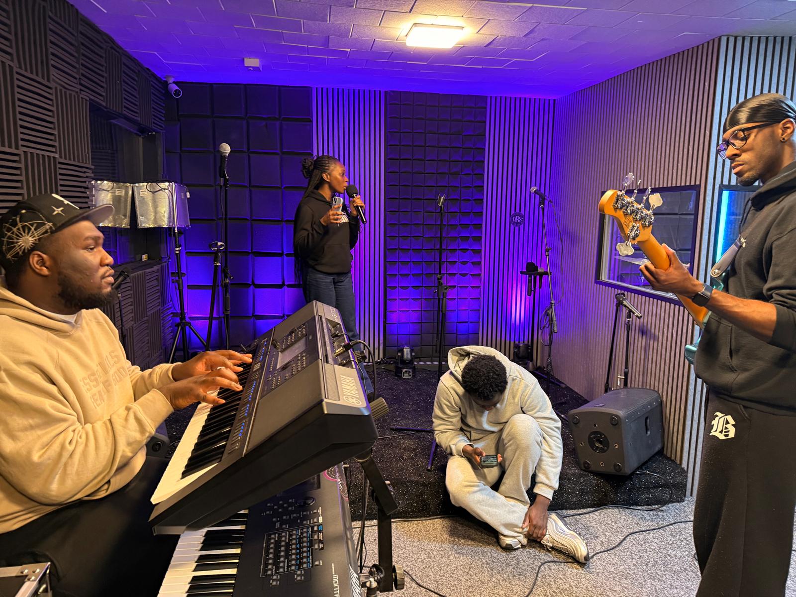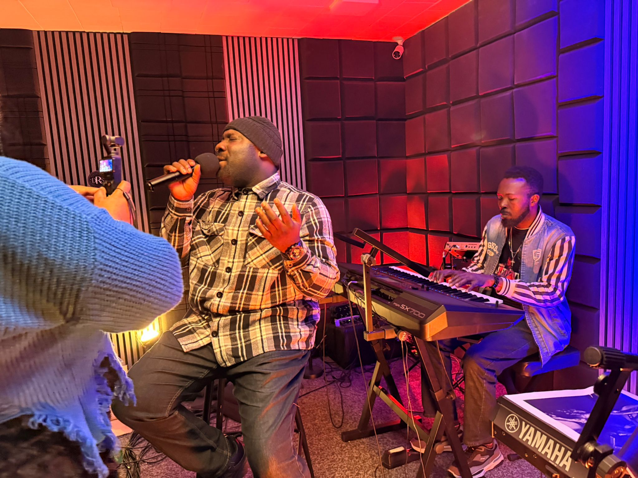 A passionate lead singer takes the mic, backed by talented vocalists and musicians in full performance mode. The energy in the room captures the spirit of collaboration and creativity that defines every live session at Darocam Studio.