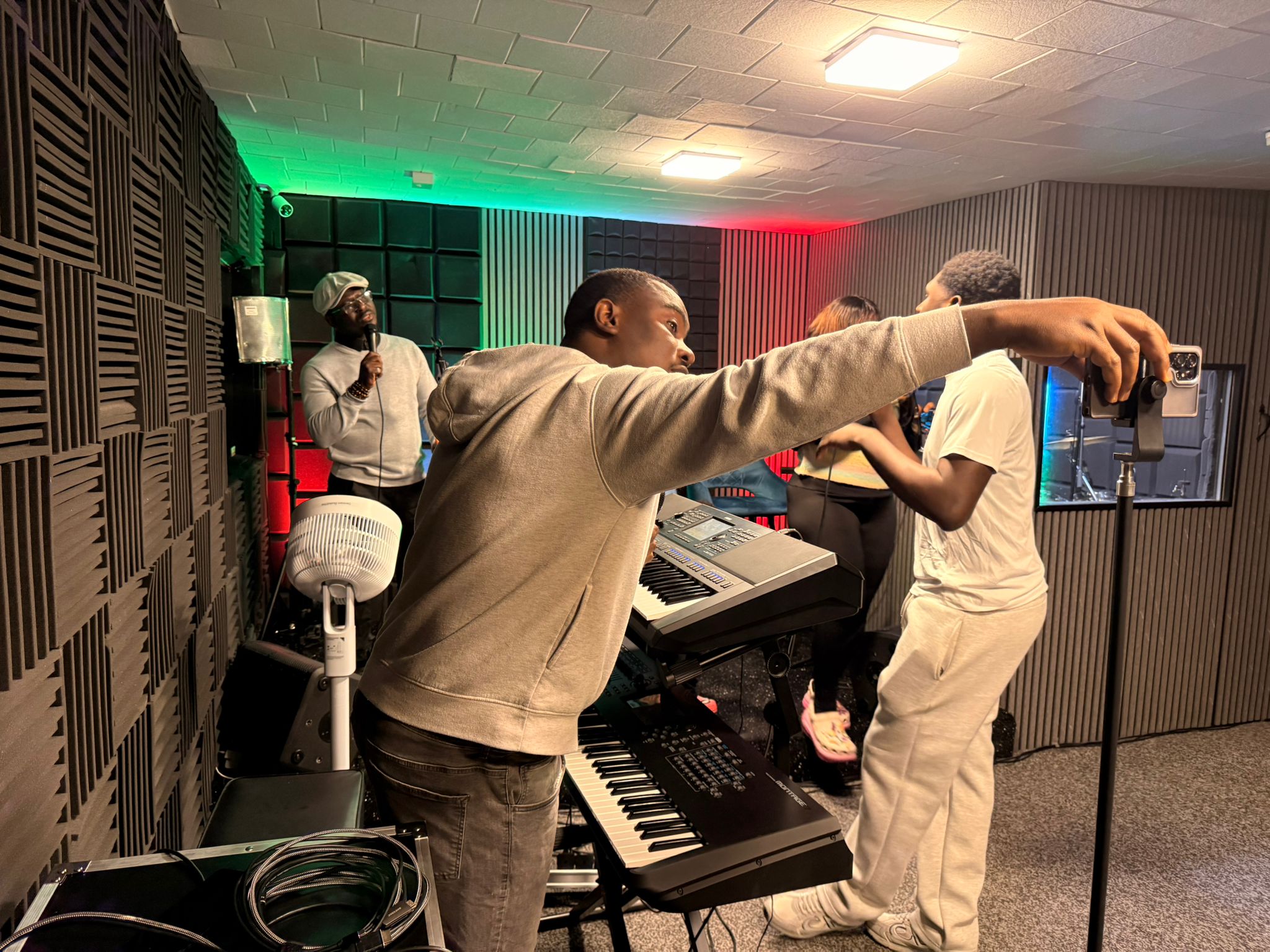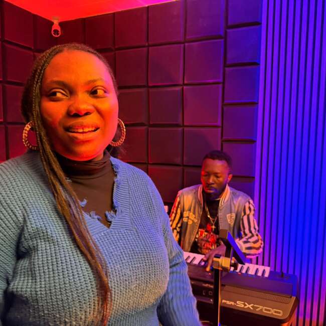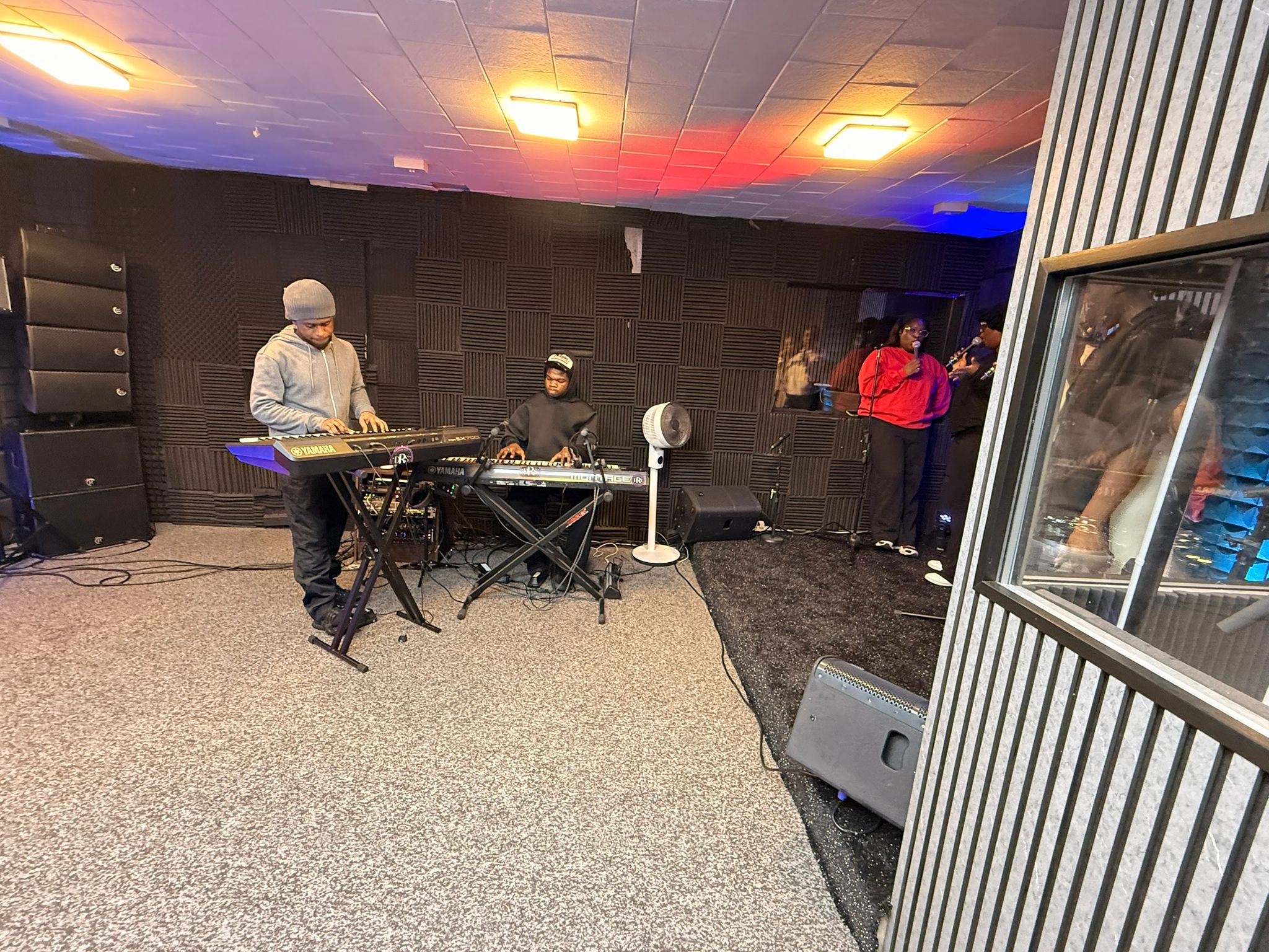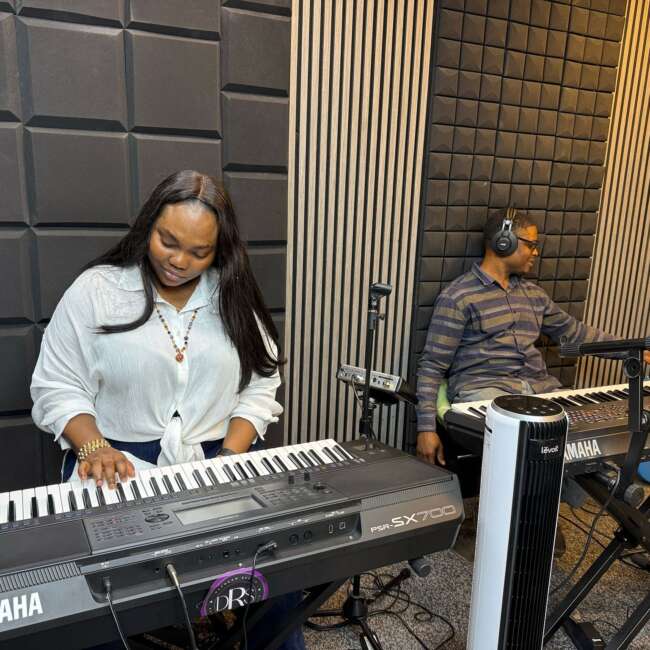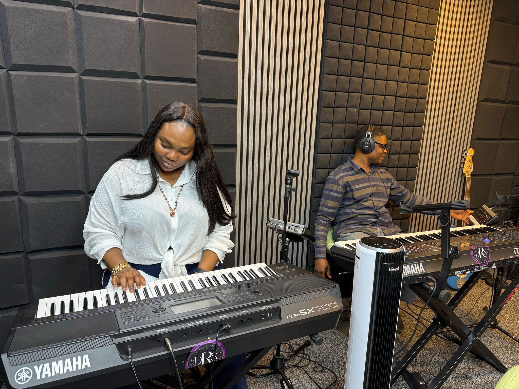 A candid studio moment as a vocalist practices a new song alongside a pianist. The pair’s focus and collaboration capture the essence of learning and creativity, where every note, melody, and mistake becomes part of the music-making journey at Darocam Studio.