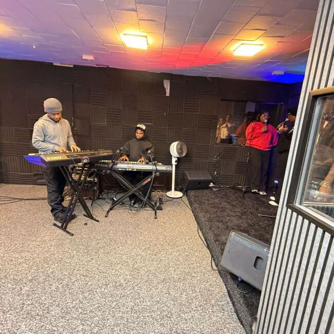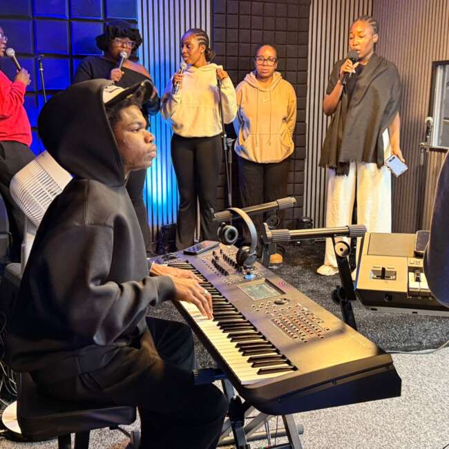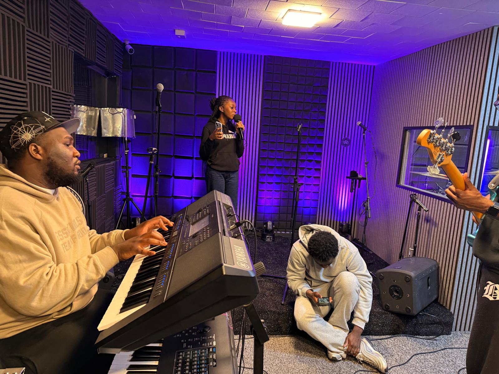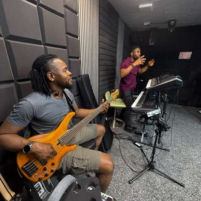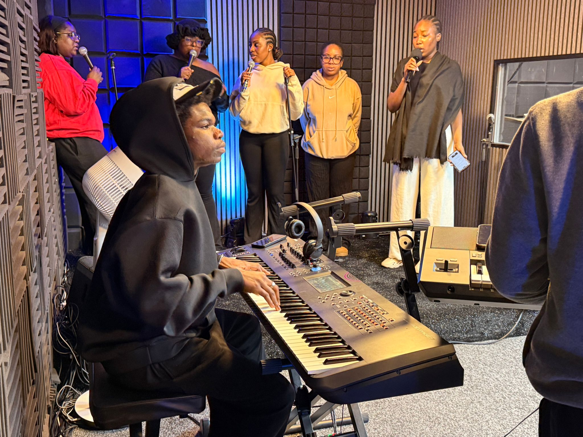 A candid studio moment as a vocalist practices a new song alongside a pianist. The pair’s focus and collaboration capture the essence of learning and creativity, where every note, melody, and mistake becomes part of the music-making journey at Darocam Studio.