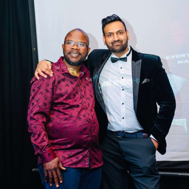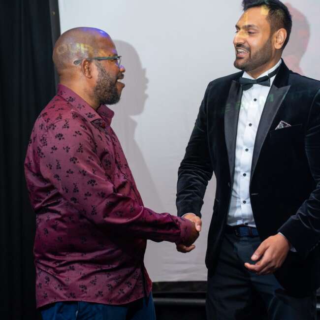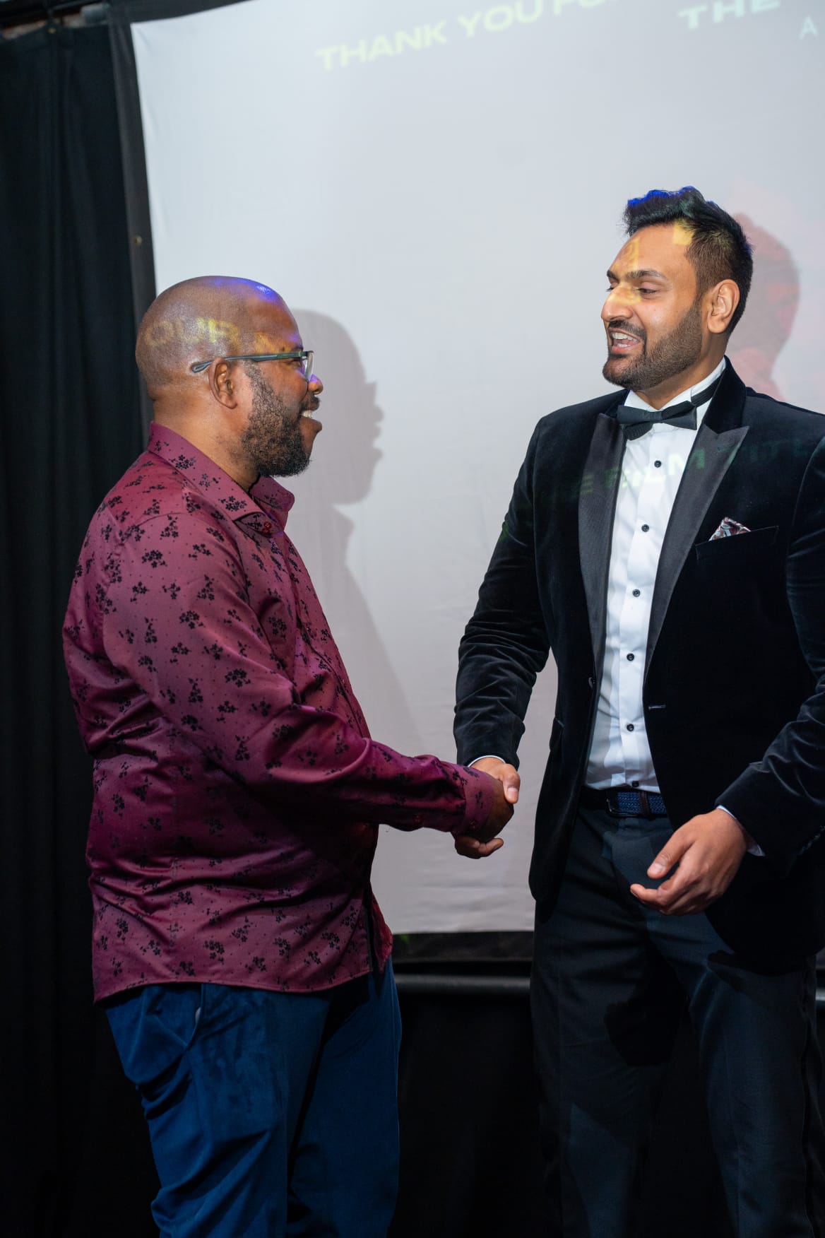 Two hosts engage in an exciting podcast session against the signature Darocam Studio backdrop. The relaxed setup and professional ambiance capture the studio’s versatility — from music production to podcast creation, every voice finds its space here.