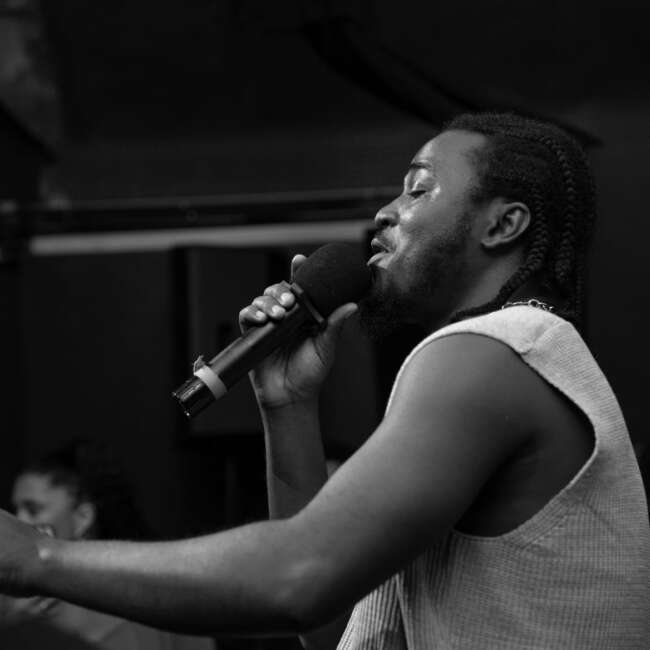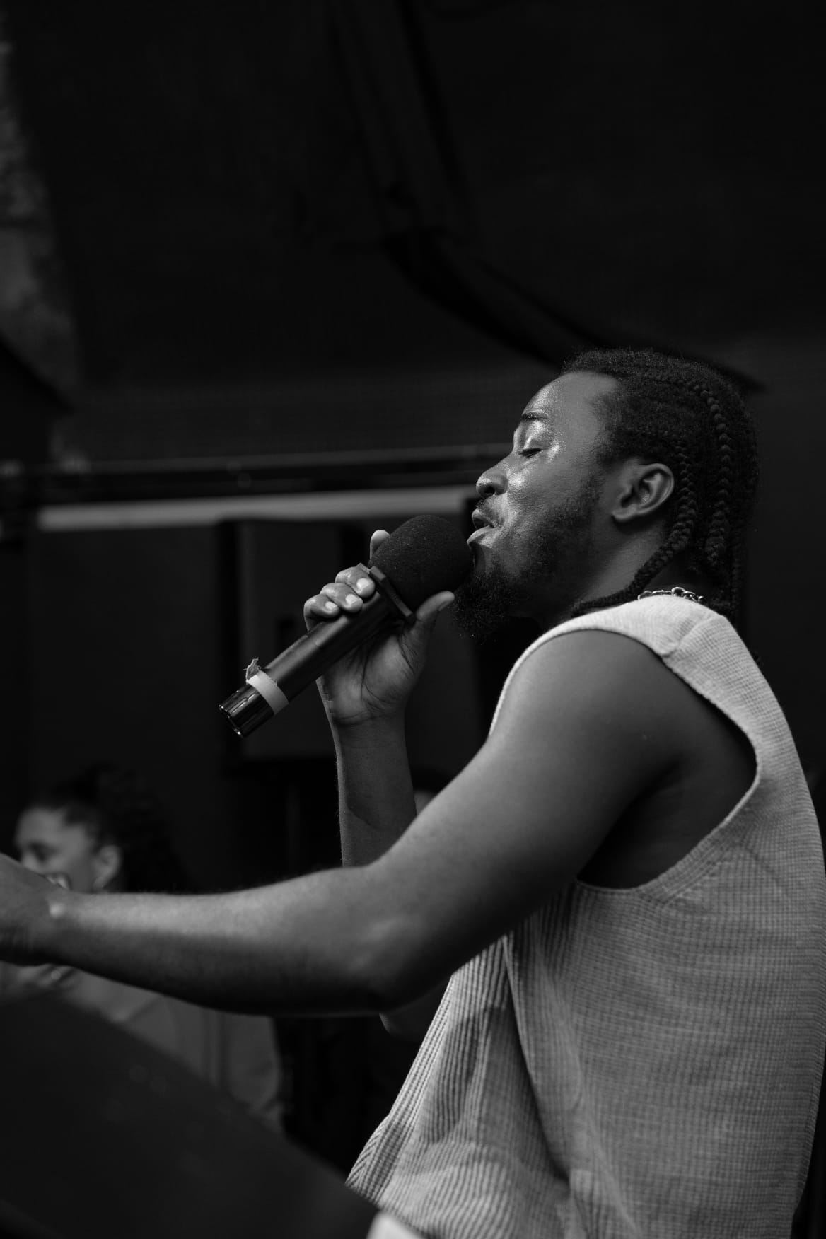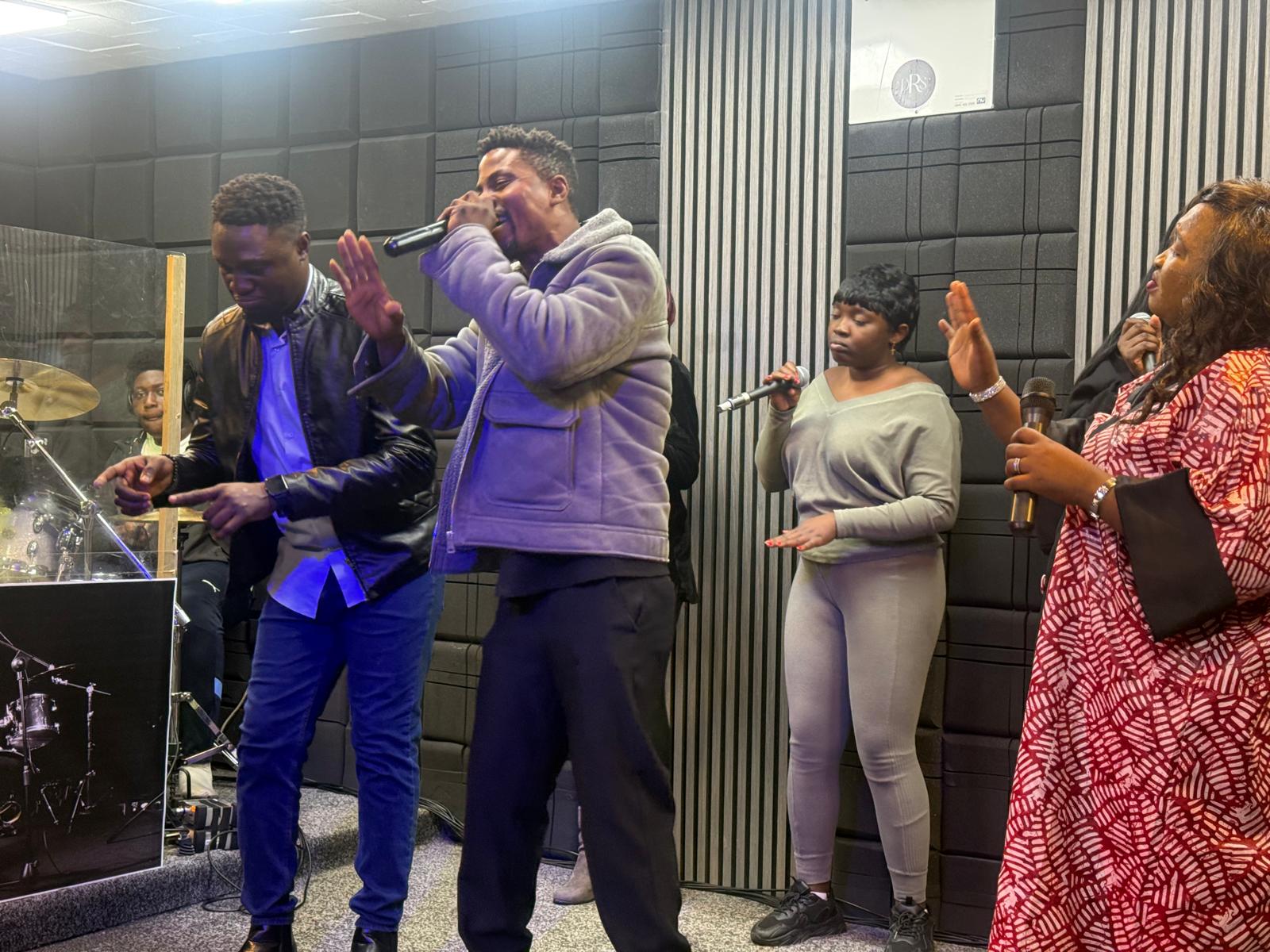 A soulful moment captured during a live ministration — the lead vocalist pouring out emotion into the microphone, surrounded by backup singers and musicians in harmony. This shot reflects the vibrant energy and spiritual connection that defines every session at Darocam Studio.