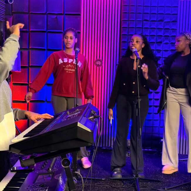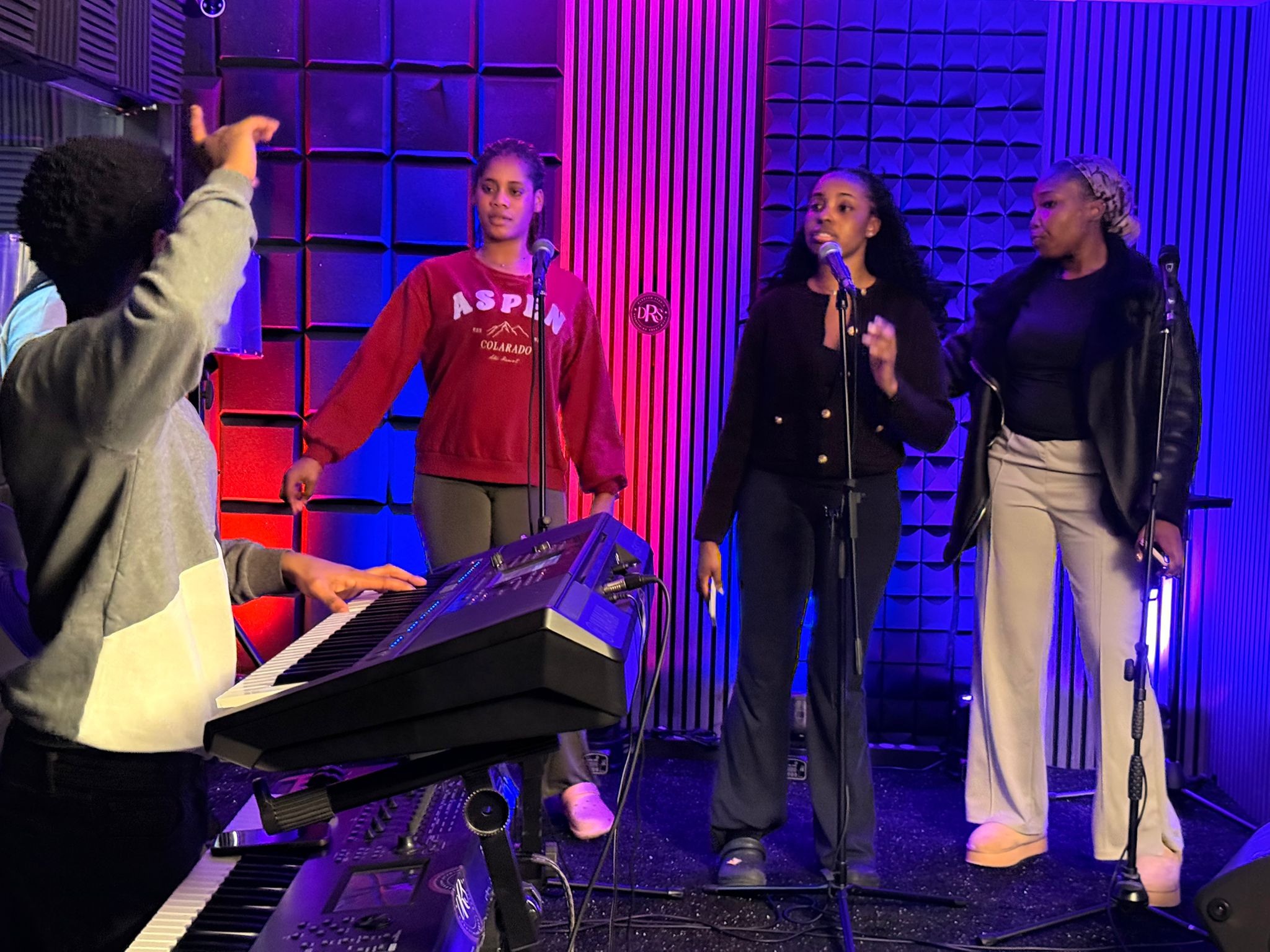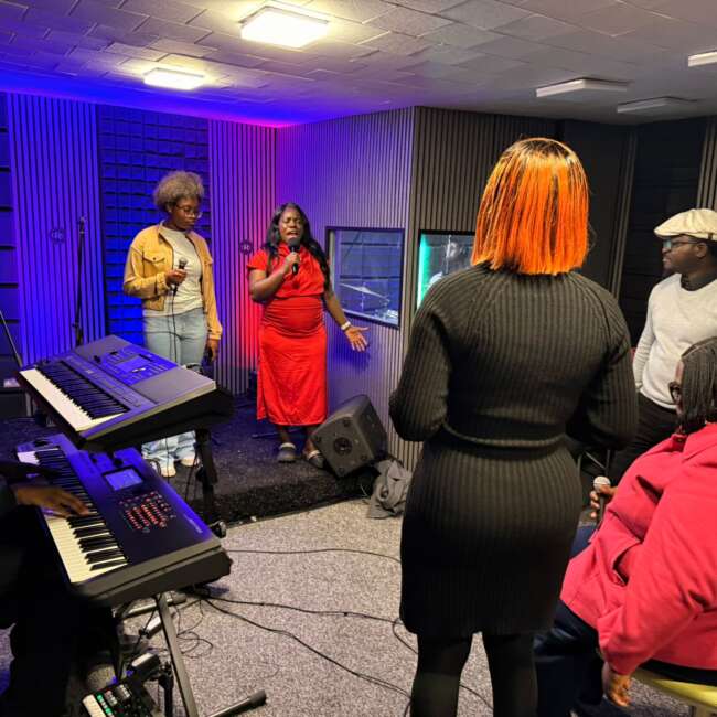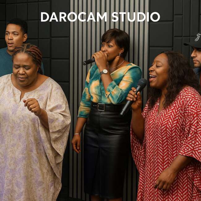 A beautiful vocalist records alongside her backup singers during an analogue session, dressed elegantly and fully immersed in the music. The warmth of the setup and her expressive delivery showcase Darocam Studio’s commitment to authentic sound and timeless artistry.