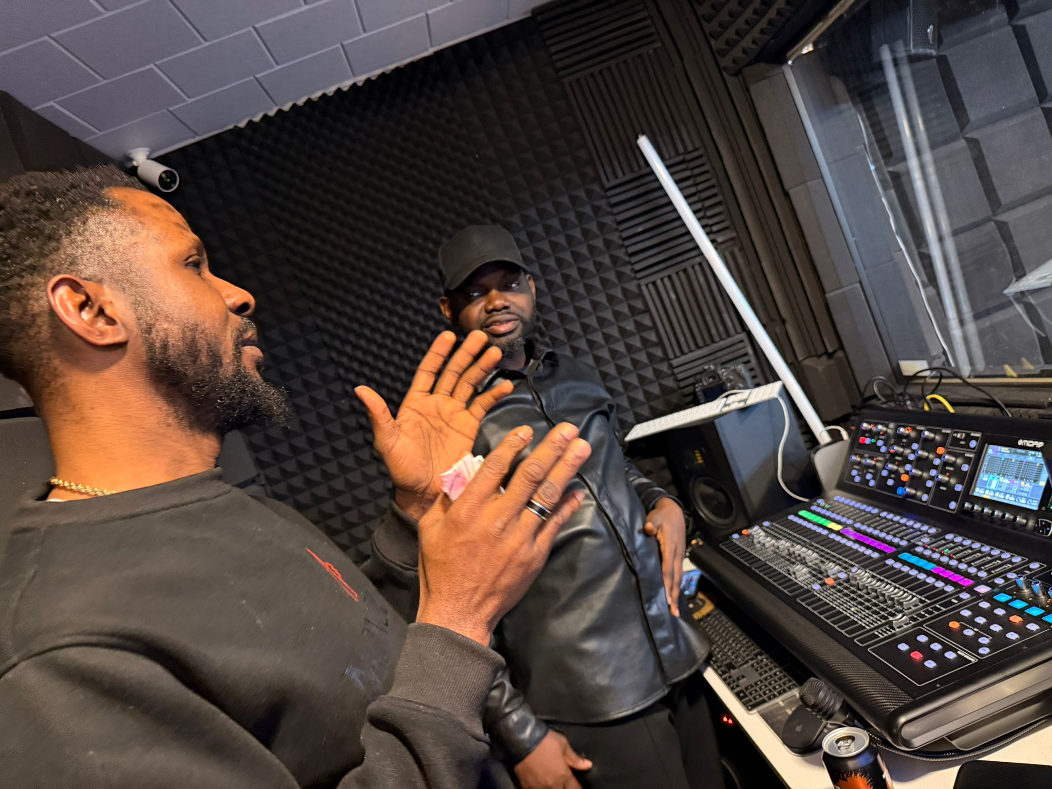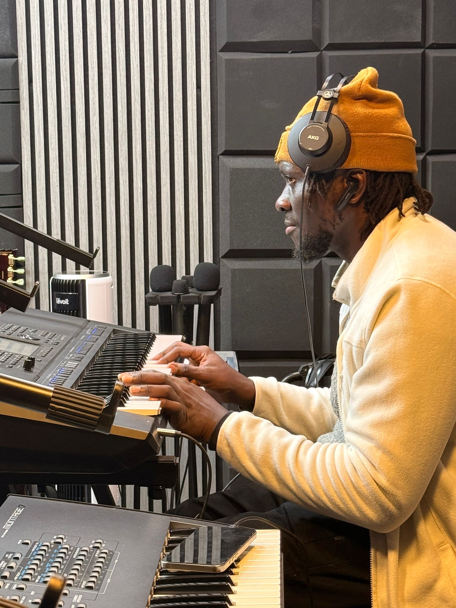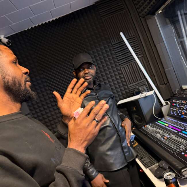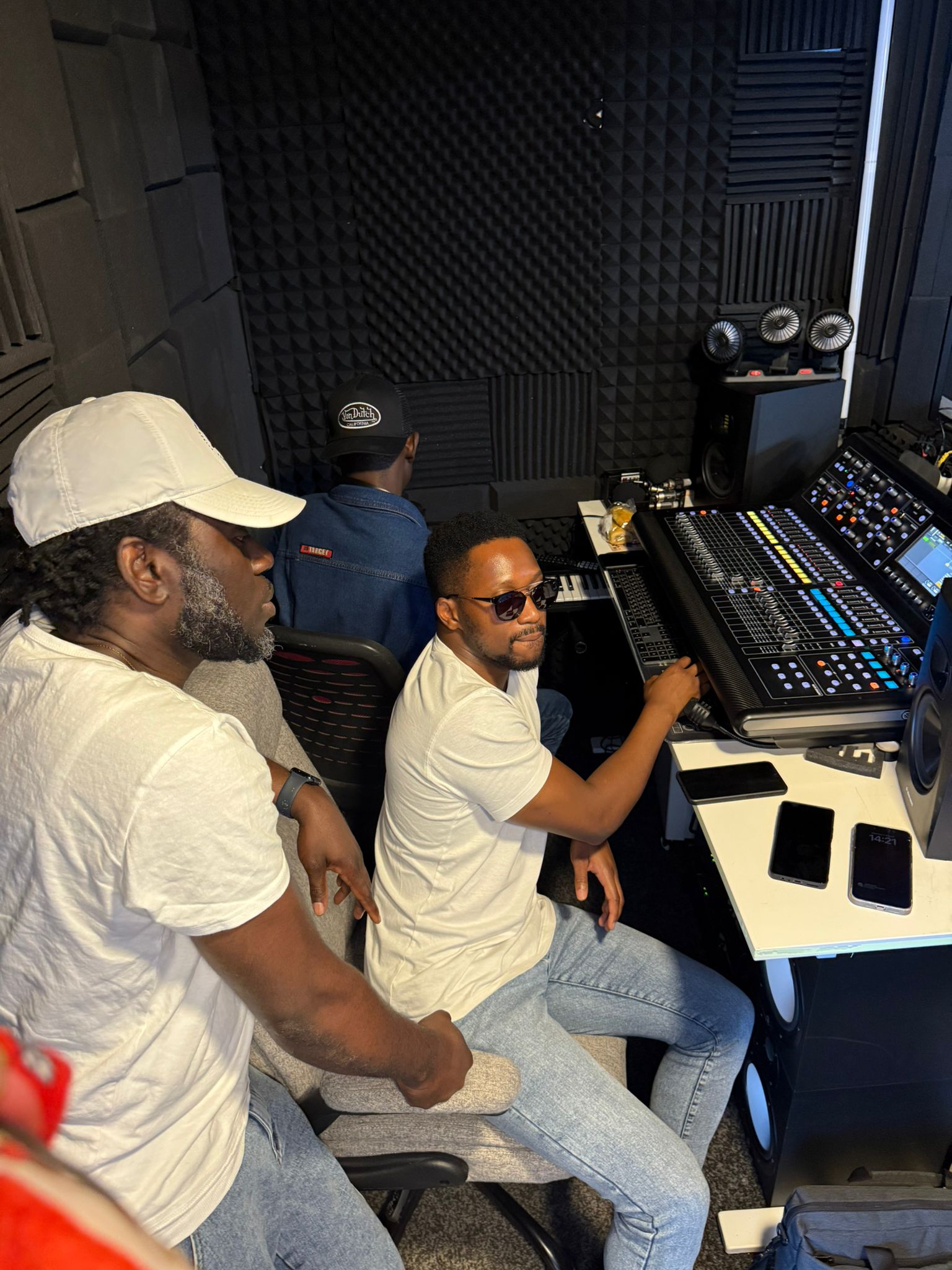 An omele drummer adds his rhythms to a new track while sharing laughs and light conversations with the producer. The friendly atmosphere and creative flow perfectly capture Darocam Studio’s blend of professionalism and genuine joy in music-making.
