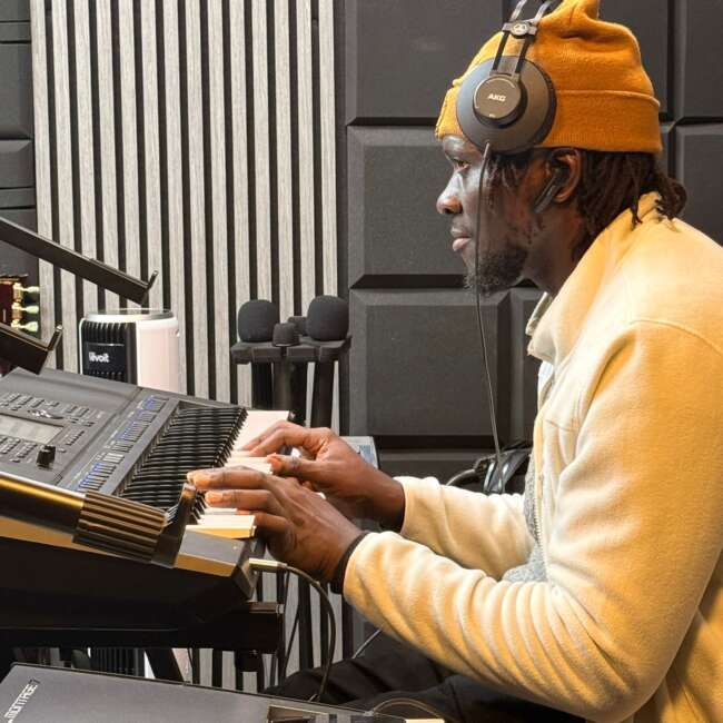 A skilled talking drummer records rhythmic layers during a song tracking session. The expressive tones and dynamic beats bring cultural depth to the music — showcasing Darocam Studio’s dedication to preserving traditional sounds within modern production.